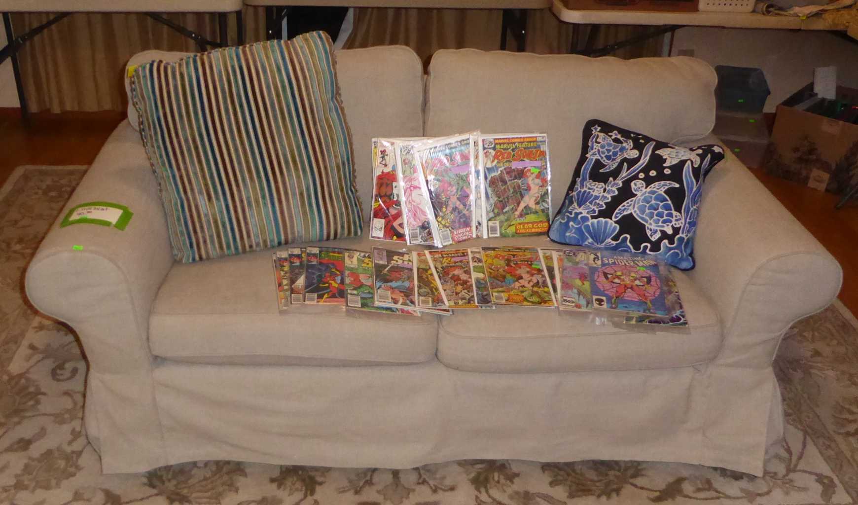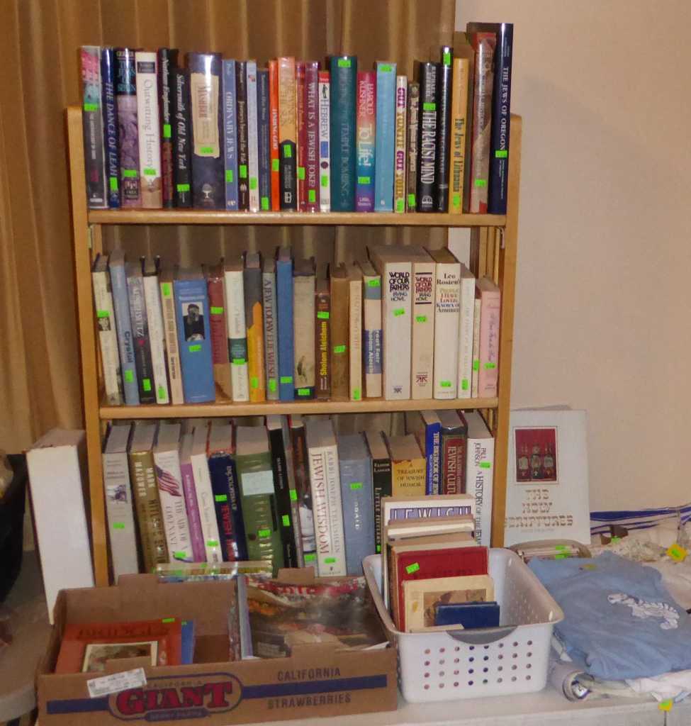 Friday, Noon to 4:00 p.m., Saturday & Sunday 11:00 a.m. to 4:00 p.m., 2446 Devon Ave., Eugene (Coburg Rd. to Riverview to Devon), wide variety of wonderful books on Judaism/Yiddish, history/holocaust, literary & popular fiction, classics, poetry, social issues, philosophy, math, music & more, sheet music & songbooks, Pearl snare drum, mandolin, old collectible toys, comic books, matching sofa & loveseat, Ethan Allen coffee table, original art by Marit Joe Giddings-Axton, full size bed, highboy dresser, white Ikea desk, casual Ikea dining set, Wedgwood "California" pattern, Franciscan Desert Rose, Liberty Blue, Pfaltzgraff & Longaberger dinnerware, sewing notions & fabric, upright freezer, stainless steel garage shelving, chop saw, hand tools, Wilton 1750 vise, pet supplies & more!