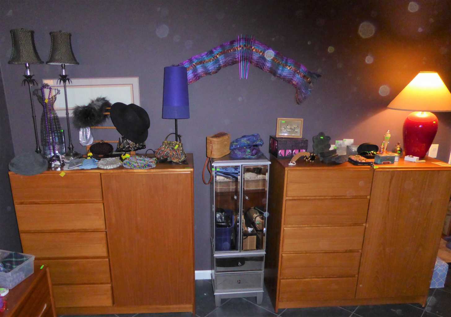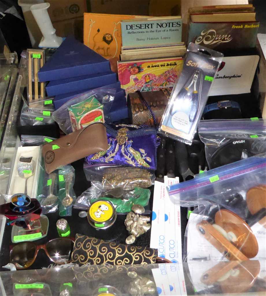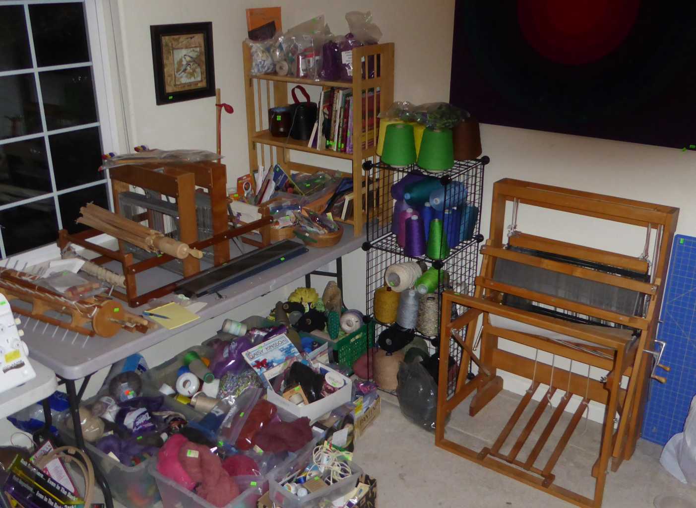 Thursday, Noon to 4:00 pm, Friday, Saturday & Sunday, 11:00 am to 4:00 p.m., 2784 St. Lucia St,, Eugene (off of Crescent), teak dining set, bedroom set, bookcases, lounge chair, curio cabinets, bar stools & desk, cedar chest, antique writing desk, library of books, LP's, CD's, DVD's, cameras, Yamaha keyboard, fine art, vaseline glass, pottery, art glass, Edward Gorey collection, textile studio featuring: Fireside 42", 6 shaft loom w/bench, Clemes & Clemes electric drum carder, 16", 8 shaft Nilus Leclerc Dorothy model table loom, Spinolution Pollywog spinning wheel, Schacht electric double end bobbin winder, Harrisville design warping reel, fiber cone tree, swift, yarns galore, Juki serger & Bernina sewing machine; jewelry and jewelry making supplies, stunning clothing, gourmet kitchen, upright freezer, floor safe, tools, tool chests, Trek 7900 bicycle, pet supplies, yard decor, concrete statuary & more!