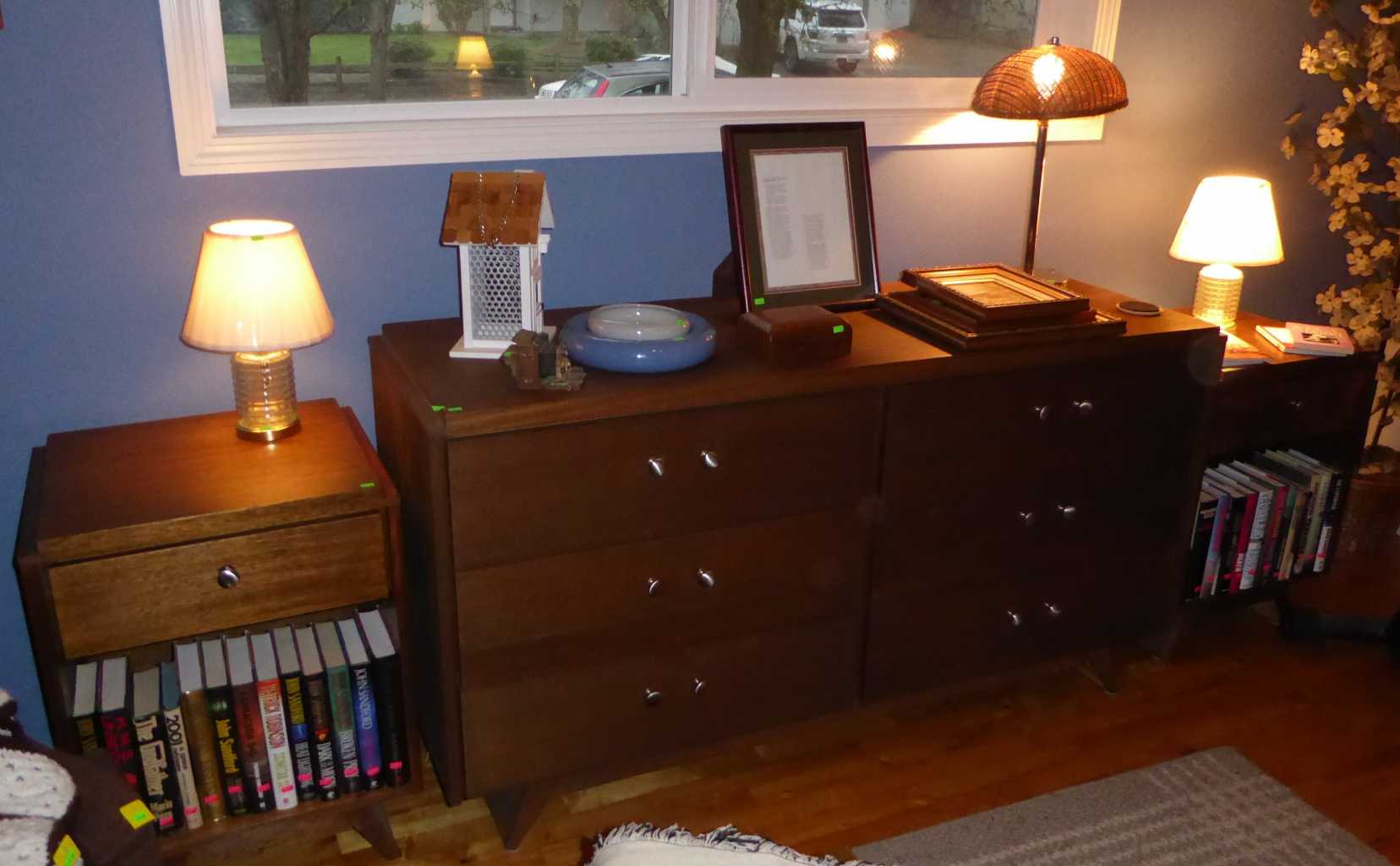 Friday, Saturday & Sunday, 11:00 a.m. to 4:00 p.m., 2424 Leyton Lane, Eugene (River Rd. to Ruby Ave. to Leyton), mid-century teak dining set & matching cart, modular wall unit, 1970's original art, lawyers bookcase style cabinets, Heywood-Wakefield Old Colony bookcase/cabinets, desk & twin headboard/footboard, mid-century dresser & 2 matching night stands, Lane blonde upright cedar chest, futon, King-size bed, lift-chair, Hollywood Regency style upholstered chairs & coffee table, sofa, Gorham "Accent Black" crystal stemware, Touraine pattern english flow blue, Spode Christmas Tree dinnerware, Heisey Crystolite crystal, jewelry, quality vintage & contemporary Men's & Women's clothing, vintage wind-up clock collection, LP's, 45's, CD's, books, quilting fabric, 3-piece iron bistro set, full kitchen, matching Kenmore front-load washer & dryer, large upright Frigidaire freezer, camping gear, hand tools, garden tools, garage cabinets, Troybilt mower, ladders, patio set & more!